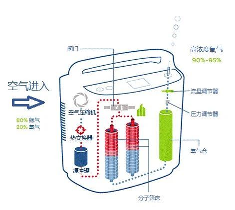 分子篩制氧機(jī)是目前市面上比較成熟的制氧方式,也是大部分家用制氧機(jī)的工作方式。分子篩制氧機(jī)通常由空氣壓縮機(jī)、變頻器、控制閥、分子篩吸附系統(tǒng)、過(guò)濾器、流量計(jì)、吸氧管或吸氧面罩組成。(如圖2)